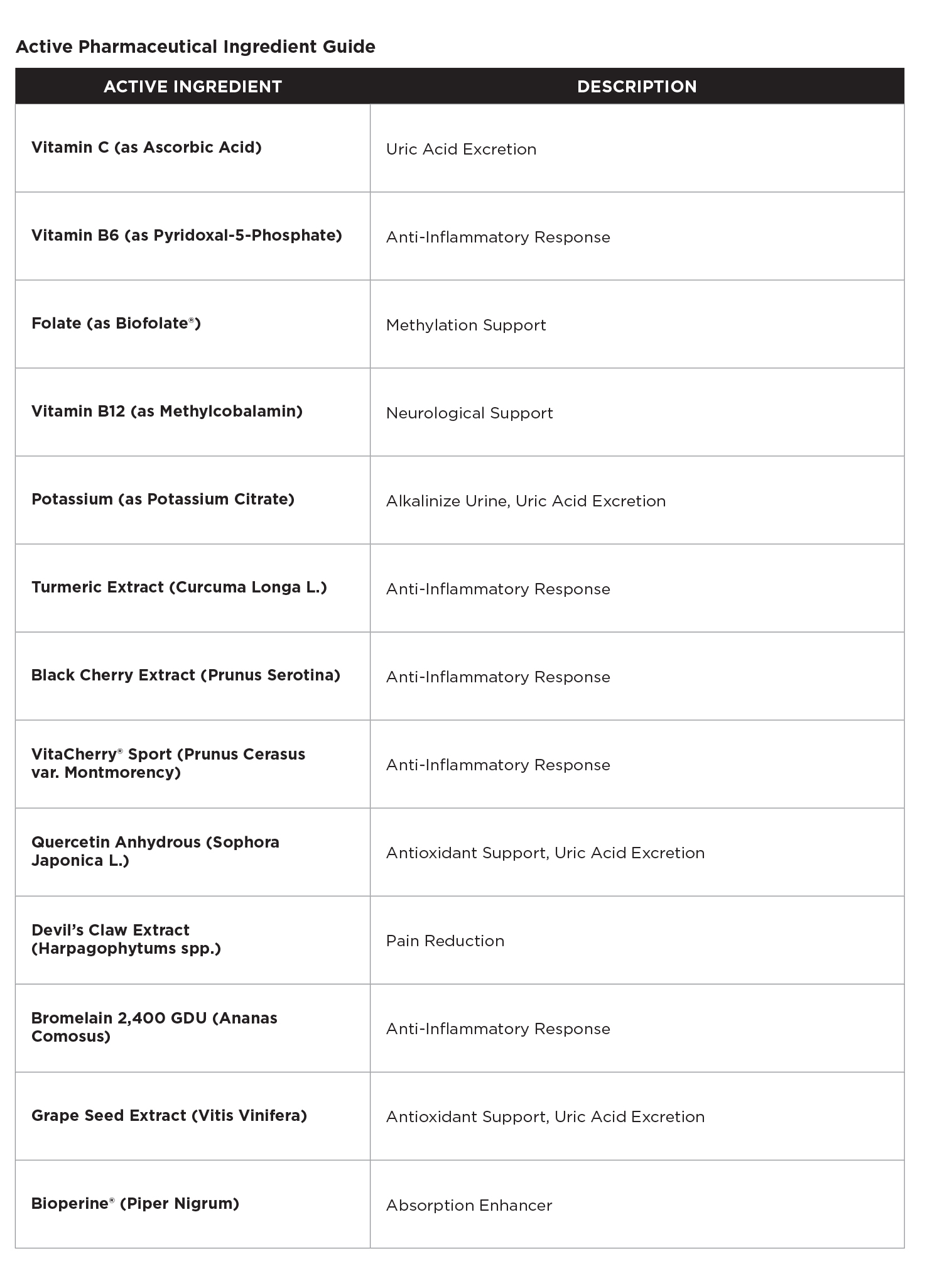 The active ingredients in EB-GOUT™ work together to break the cycle of recurring gout flares including the intensity, frequency, and duration: